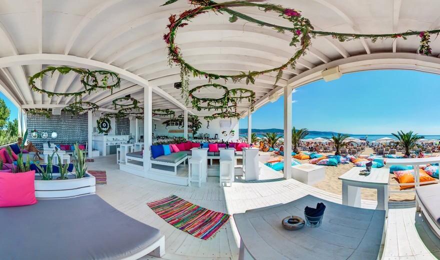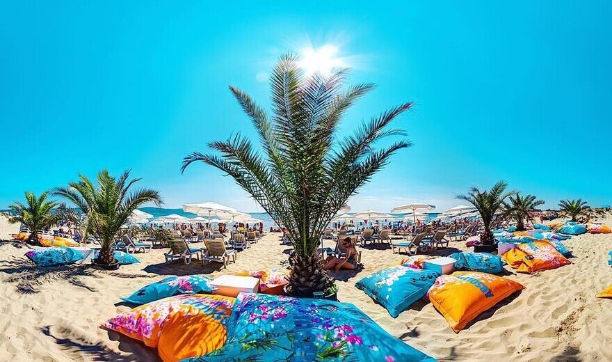 Плажът е аранжиран с цветни барбарони и свежи палмови дръвчета, а койтейлите са винаги поднесени с усмивка.